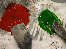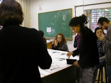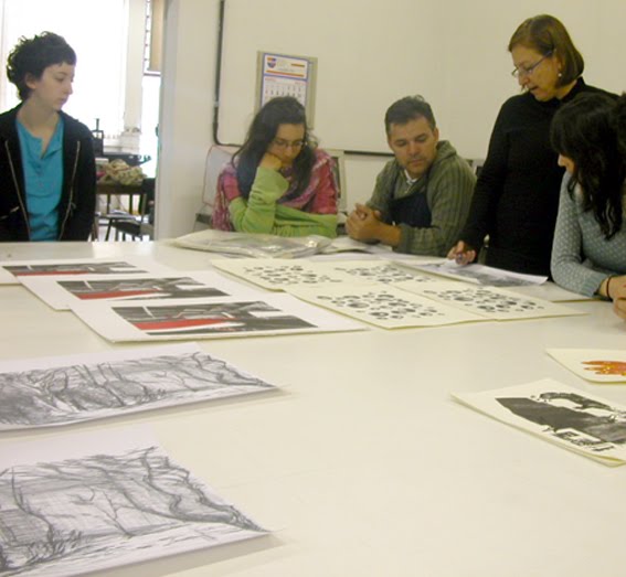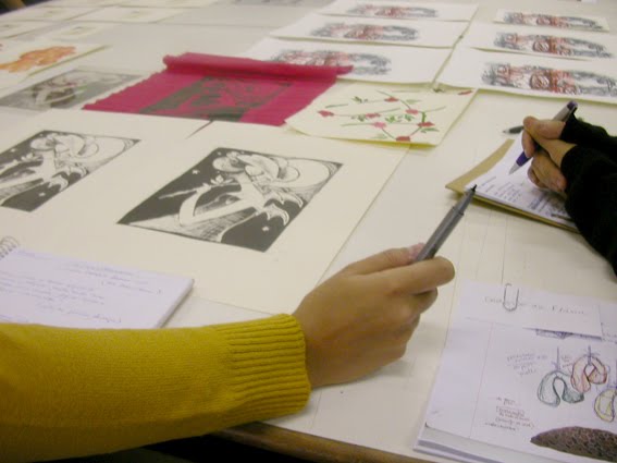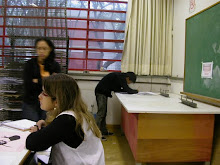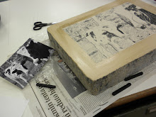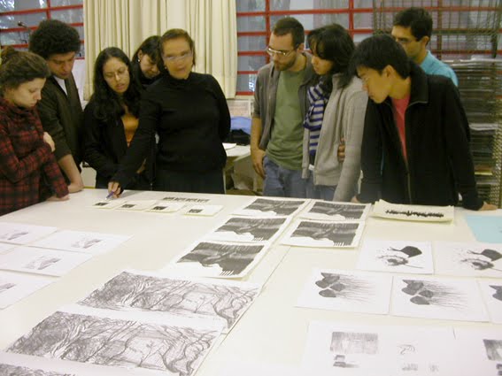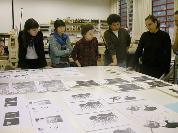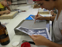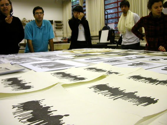 Depois de receber a impressão, a transparência é colocada sobre a matriz da gravura que receberá as novas cores ou desenhos, com o lado da tinta para cima.